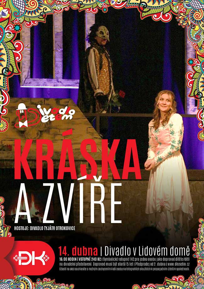 „Krásná dcera zchudlého kupce se dobrovolně vydá do zakletého zámku uprostřed hlubokých lesů, aby zachránila svého otce. Zde prožije hrůzný i nečekaně láskyplný vztah s tajemným monstrem,“ představují děj pohádky divadelníci z hostujícího souboru Tyjátr. Objeví dívka, která žije v přepychu na zámku, kdo je zaklet do podoby netvora? To v pohádce Františka Hrubína v režii Radka Chmely prozradí herci Tomáš Krajča, Lukáš Laciga, Natálie Matyáková, Dušan Mikeštík, Blanka Gabrhelíková a další.