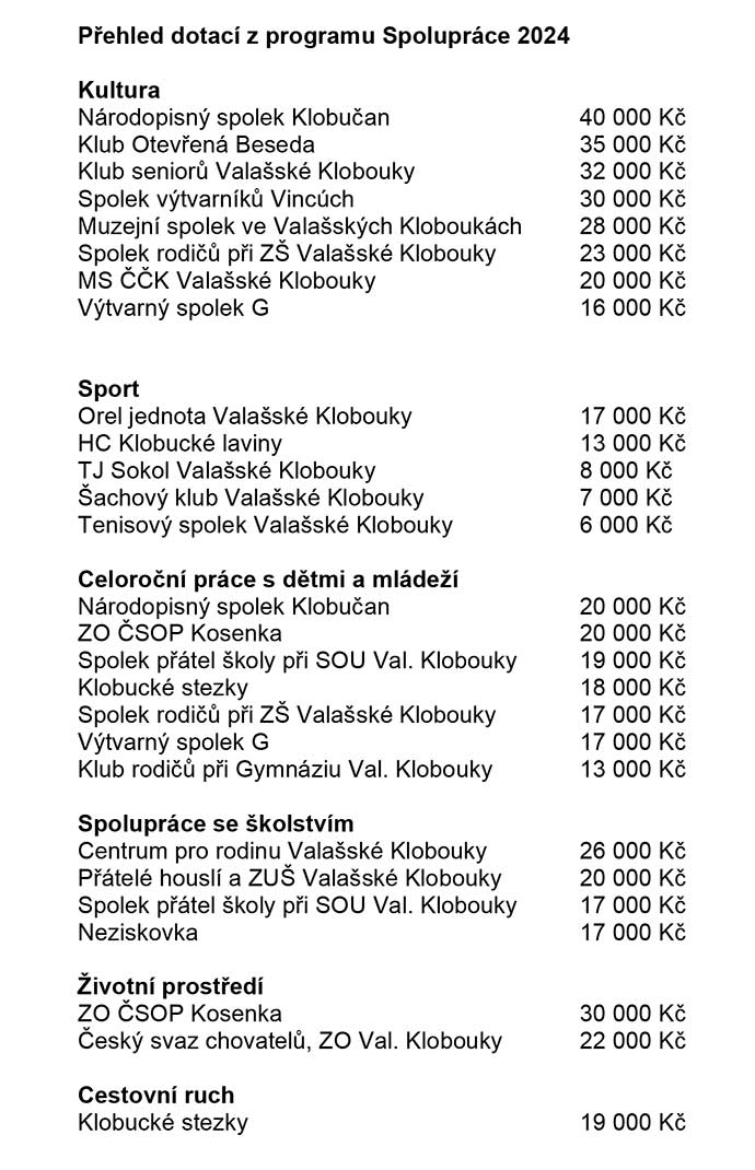 Podporu získal také Český svaz chovatelů Valašské Klobouky, který v srpnu uspořádá výstavu drobného zvířectva. ČSOP Kosenka má v plánu výukové programy o lidových zvycích pro děti a chystá také 44. ročník Tradičního kosení a školy ochrany přírody a krajiny. Nový spolek Neziskovka si pak stanovil za cíl zorganizovat soutěž v poskytování první pomoci.