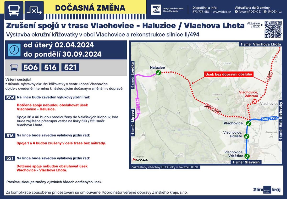 Z důvodu výstavby nové okružní křižovatky ve Vlachovicích a opravě silnice budou na linkách zavedeny výlukové jízdní řády a budou dočasně zrušeny přímé spoje v úsecích Vlachovice – Haluzice a Vlachovice – Vlachova Lhota. Zastávka „Vlachovice, sídliště“ bude přesunuta.