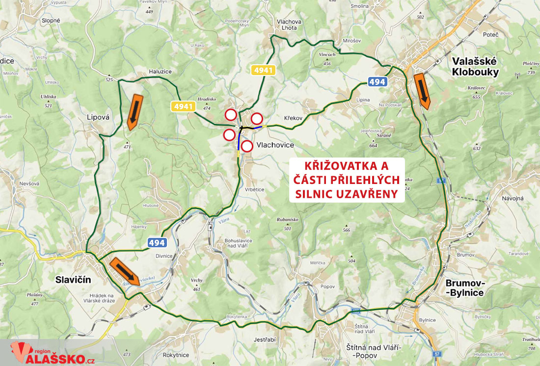 Původně měla být uzavírka realizována po částech, rozhodnuto, ale bylo o úplné uzavírce. To znamená, že například z Valašských Klobouk přes Vlachovice do Slavičína ani opačně neprojedete. Úplná uzavírka z důvodu rekonstrukce komunikace a výstavby okružní křižovatky má trvat do 30. září.