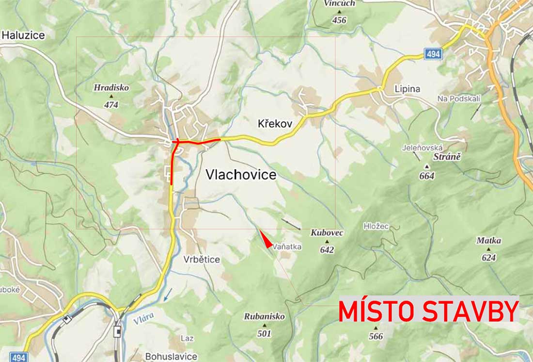 Od 2. 4. 2024 do 30. 9. 2024 bude v místě stavby UZAVŘENA silnice II/494 a III/4941 v obci Vlachovice-Vrbětice pro veškerou dopravu.