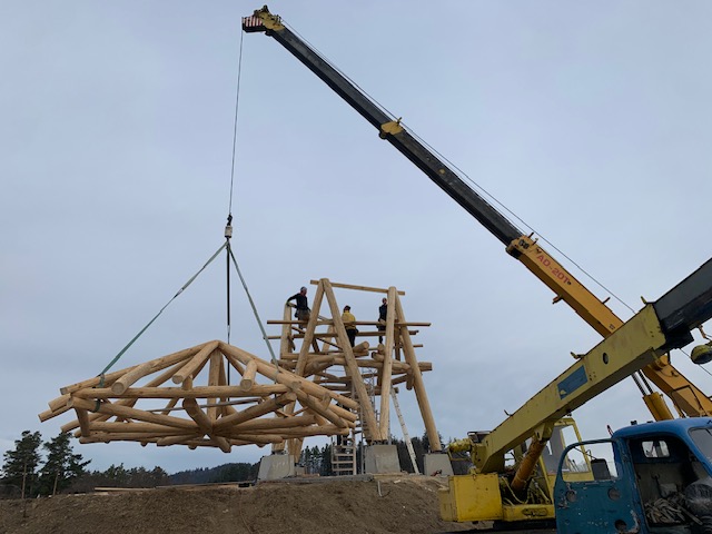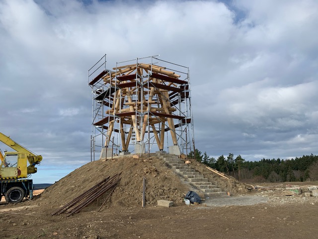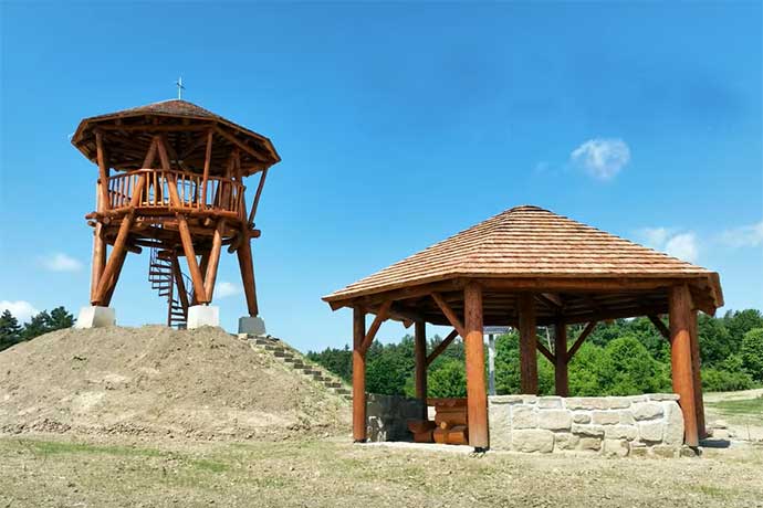 Při stavbě byl použit klasický přírodní materiál typický pro zdejší okolí – modřínové dříví a zdejší pískovcový lomový kámen. Střechy vyhlídky i altánu jsou pokryty ručně vyrobeným šindelem. Na střeše vyhlídky se nachází kovaný kříž, celková nosná konstrukce obou staveb je z kulatiny.