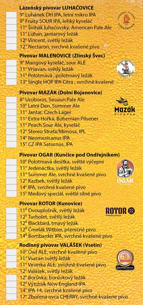 Největším změna bude v pivovarech, ty přijedou osobně se svým vlastním stánkem. Těšit se můžeme na 37 druhů piv od pivovarů Mazák, Ogar, Rotor, Malenovice, Valášek a Lázeňský pivovar Luhačovice. K tomu bude posílena gastro zóna, kde ochutnáme francouzské palačinky, hot dog, hamburgery, topinky, grilované speciality, kotlíkový guláš a mnoho dalších dobrot a specialit.