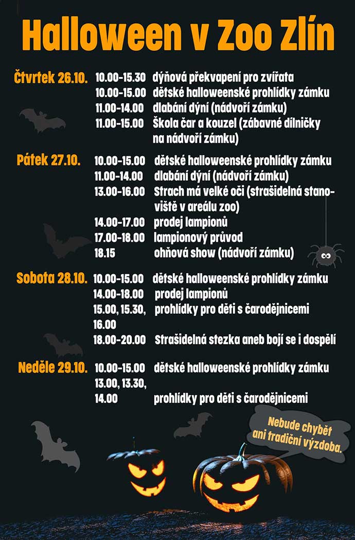 Pokud hledáte program pro blížící se podzimní prázdniny, zavítejte s dětmi do zlínské zoo. Od čtvrtku 26. do neděle 29. října zoo připravila pestrý program připravený v rámci oslav starodávného keltského svátku Halloween. Areál zahrady rozzáří nápaditá a zábavná výzdoba, ve které nebudou chybět čarodějnice, kostlivci, obrovské pavučiny, netopýři nebo dýně. Děti se mohou těšit na oblíbené dlabání dýňových „lampiček“, komentovanou prohlídku s čarodějnicemi, lampionový průvod nebo Školu čar a kouzel, pro starší budou připraveny večerní ohňová show a noční strašidelná stezka. Speciální dětské halloweenské prohlídky nabídne zámek Lešná.